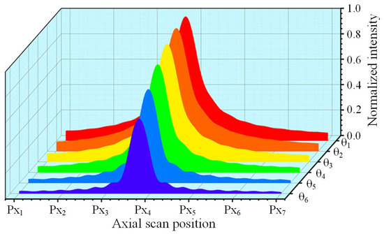 The normalized energy-response curves of the detector behind the pinhole with a defocusing distance of 650 μm behind the focus at different tilt angles are shown in Figure 7. The curves represent six different dip depths in the range of 0–10°. Figure 7 shows that as the tilt angle increases, the peak energy value decreases gradually, but the axial position corresponding to the peak position remains unchanged. It is important to note that the variation in each energy curve at different tilting depths was not obtained based on the response curve at time zero, which was reduced by the same multiple along with the axial position.
