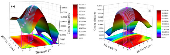 Figure 9a,b displays the change process trajectory of the data array calculated by the PCC strategy and the peak clustering vector when ZCSO is 0.5 μm and the tilt angle is 5°, and when ZCSO is 0.3 μm and the tilt angle is 6°. When the enumeration method is used for continuous surfaces, the current data and all the datasets of tilt depth and ZCSO are used as the fitting surface for the similarity matching results. The blue-covered area is the dataset lattice calculated using the PCC strategy, the purple square is the core coordinate of the peak clustering vector during the calculation, and the arrow direction indicates the direction of the calculation path change. It is important to note that the angle between the two boundaries farthest from the center is chosen as the initial iteration point to demonstrate the algorithm’s effectiveness, while typically the starting iteration point is in the central region. Figure 9 clearly illustrates that the PCC strategy significantly reduces the calculation of similarity processing, increases the processing speed, and guarantees the system’s real-time target.