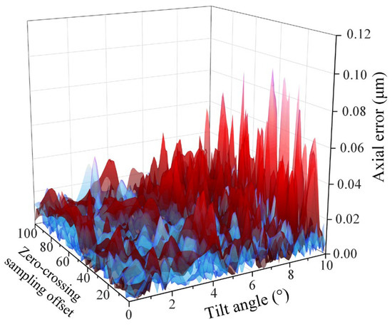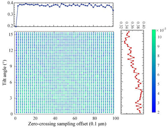 The PCC error distribution was obtained through simulation experiments at all tilting intensities and ZCSO conditions, as shown in Figure 10. The central lattice’s color represents the error level, with one dimension remaining unchanged while the error curve changes with the other shaft. The error level decreases and then increases as the tilt strength changes, except near the zero-crossing, where the error level first decreases and then increases. After multiple variable-parameter simulations, it was concluded that the error turning into a larger tilt strength was related to the system parameters, but the overall trend remained the same.