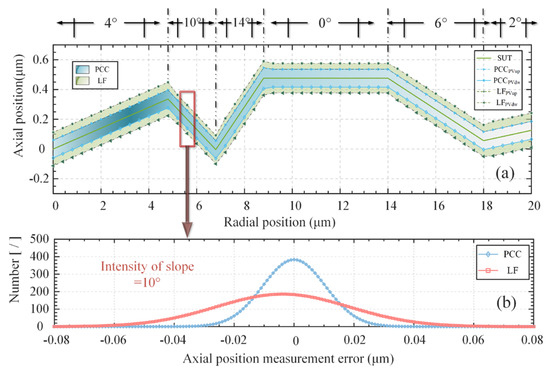 To further demonstrate the effectiveness of the proposed algorithm, we conducted simulation experiments. Firstly, we constructed a virtual 2D curve, represented by the solid green line in Figure 11a. The curve was composed of line segments at various oblique angles, with a radial length of 20 μm and a high-axial vector of 0.48 μm. The virtual probe continuously performed axial scanning of the measured points along the axis. To ensure high confidence, we conducted 1000 simulations at each given measurement point position. The system parameters were kept constant using a probe. The sampling steps of the calibration dataset and simulation physical experiment were consistent with those mentioned earlier, namely, 10 nm and 1 μm (±0.1), respectively, and the radial sampling interval was 0.4 μm. To simulate the noise effect in the physical experiment, we set the signal-to-noise ratio to 40 dB, and a random ZCSO was also set. The blue area in the figure represents the range of the measured point positions obtained by the PCC during the simulation’s physical experiment of the current signal-to-noise ratio, and the green area represents the range of positions obtained by traditional linear fitting. The figure indicates that the proposed compensation algorithm can significantly reduce the measured error range at each measured position. Figure 11b illustrates the error distribution when the tilt intensity is 10°, where the horizontal axis represents the axial measurement position error, and the vertical axis represents the distribution number of 1000 repeated measurement points at different error values. It can be observed that the errors are distributed based on the Gaussian distribution, the error distribution of the compensation algorithm proposed in this study is more concentrated, and the number of points falling at zero is significantly greater than that of the traditional zero-crossing fitting algorithm. Moreover, the zero-crossing fitting method inherently contains errors. Therefore, the proposed compensation strategy is proven to be effective in reducing the original error range and enhancing the system’s robustness.
