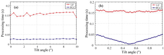 To verify the effectiveness of the rapid recognition algorithm based on the peak clustering algorithm, a personal computer equipped with the ThinkBook 14 G4+ IAP and the 12th Gen Intel(R) Core(TM) i5-12500H 2.50 was used. Figure 15a,b shows the computing efficiencies of the traversal method and PCC-based algorithm at different tilt intensities and offsets, respectively. It can be observed that the PCC algorithm has obvious efficiency advantages and satisfies the real-time requirements of the system. Over the entire range, the average processing time of the PCC algorithm was 0.02606 s, and the average time of the traversal method was 0.15677 s; this improved the efficiency by 83.37%.
