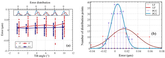 To verify the repeated accuracy of the compensation strategy proposed in this study and to avoid contingencies, 100 repeated measurements were conducted at each angle, and the results were compared with those of the traditional LF method. The results are shown in Figure 17a,b, where the upper half of Figure 17a shows the statistical diagram of the probability distribution of errors, and Figure 17b shows the error distribution pairs. The accuracy of the compensation strategy was higher than that of LF, the error distribution under the compensation strategy was more concentrated, and the bias phenomenon of the error was less than that of LF. In addition, it can be observed that the distribution and error level of LF tended to increase as a function of the tilt angle.