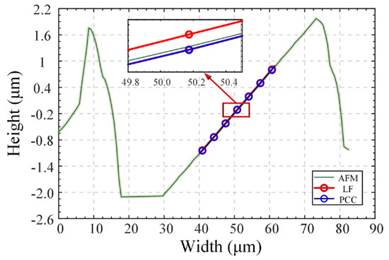 A large-grating engraving mechanism was used with quartz glass as the base and aluminum as the film layer (92% reflectivity). The carving knife was positioned on the surface of the film layer three times at different inclination angles; the waste material was not removed, and the degrees of adjustment of the carving knife were 3°, 6°, and 9°. The slot width ensured that the maximum spot size accommodated the defocusing range required to form the DCM response curve. The atomic force microscope (Dimension Icon, Bruker Corporation, MA, USA) has an axial resolution of 0.25 nm in Figure 18a; thus, its measurements satisfy our requirement to use it as a truth value. The measured results are shown in Figure 18b (the fitting results of only one grating are shown here for a condensed expression). In addition, seven sampling data positions on a random line on the three rasters were selected for measurement, registration, fitting, and analysis. The measurement results for the six angles are shown in Figure 19. The measurement error in the compensation strategy was significantly smaller than that of the traditional LF method. The average error at the compensation strategy was 17.537 nm, whereas the traditional LF error was 32.449 nm, which was slightly higher than the axial prediction error during calibration. This was because the insufficient positioning accuracy in the horizontal direction of the three-coordinate displacement platform resulted in an error in the point cloud registration, which affected the final measurement results.