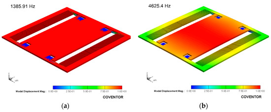 The ISLX has two pairs of transverse capacitive comb drives to detect proof-mass displacements and a pair of fixed-plate parallel capacitive elements for testing or actuation purposes. The structure of the accelerometer is shown in Figure 1b, and its dimensions are provided in Table 2. The static and dynamic responses of the device were analyzed using the finite element method in Coventorware. Figure 2 shows the first two mode shapes and frequencies of the accelerometer. The first resonance frequency of the accelerometer is found to be in plane vibration mode with a frequency of 1.3 kHz. By design, the structure’s second and higher resonance modes are at significantly higher frequencies.