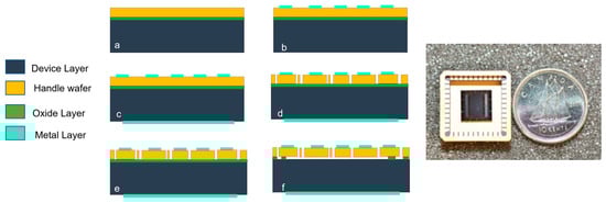 ISLX fabrication process (left): (a) starting SOI wafer with 100 μm device layer, a 5μm BOX, and a 500 μm handle wafer; (b) deposition and patterning of metal pads and traces; (c) backside metal deposition; (d) deposition and patterning of hard-mask and DRIE of the device layer; (e) diced chip; (f) die-level device release in vapor HF; and the packaged ISLX (right).
