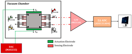 The ISLX has one pair of fixed electrodes and two pairs of sensing electrodes. In the presence of an external acceleration, the proof mass moves and causes a capacitance variation between sensing electrodes (, ). It is then converted to voltage using capacitance-to-voltage circuitry. This signal then passed through the compensator to produce the counteracting feedback force on the proof mass. The top and bottom electrodes ( and ) are to be used as actuators. A fixed DC voltage is added to the electrode, which causes the electrostatic actuator to behave linearly and generate a bidirectional force [23]. The net electrostatic force applied to the proof mass is [24]:
