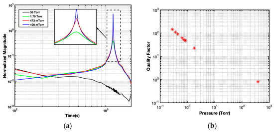 Using this test setup, a DC bias voltage of 200 mV along with a 50 mV (peak-to-peak) differential AC signal were applied to the drive electrodes (,). The applied electrostatic force is equivalent to a 1 mg input acceleration signal. As seen in Figure 5a, the resonance frequency of the system was found to be around 1220 Hz. Furthermore, as the pressure in the system was reduced from 35 Torr to 100 mTorr, the peak at resonance became sharper and stronger, indicating a transition from an overdamped to an underdamped state. The quality factor of the accelerometer for each pressure level is derived by dividing the resonance frequency by the −3 dB bandwidth from the frequency response curve. Figure 5b demonstrates that the accelerometer’s quality factor is inversely proportional to vacuum pressure.