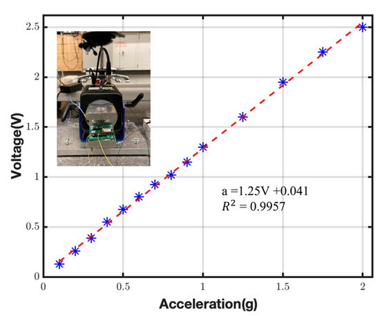 The output response of the accelerometer for various input accelerations at 200 Hz (dashed line is the fitted linear regression and * is the experimental data).