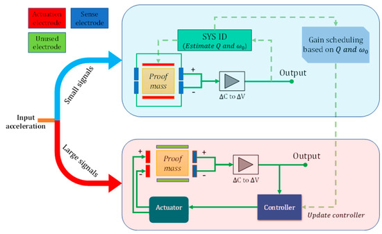 Figure 8 shows the arrangement of electrodes under different operating conditions. The accelerometer normally operates in an open-loop configuration, which lets it use the most sensitive capacitive elements to detect weak signals. A system identification algorithm is run occasionally (from once an hour to once a day) to extract the device’s resonance frequency and quality factor, which are needed for the controller design. This algorithm uses the top and bottom electrodes to apply a swept sine wave to the proof mass while detecting its response using the sense electrodes. Once strong signals near the resonance frequency of the device are detected, the electrode arrangement is changed using on-board electronic switches such that one of the two pairs of sensing electrodes is used for actuation and the remaining pair is used to detect incoming signals. In this case, the magnitude of actuation voltages is on the order of volts to compensate for hundreds of mg-level signals. The feedback loop is closed using the (updated) controller to reduce the quality factor. Once these signals are removed, the system reverts to its high-sensitivity mode of operation (open-loop).