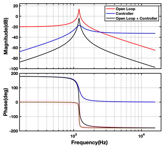 The controller frequency is set to be the same as the system resonant frequency while determines the bandwidth of the controller. A high yields narrower bandwidth and higher gain at that specific frequency. However, this might also push the system to instability. The optimal value of is thus found empirically and is chosen to be 6 in this work. Figure 9 shows the frequency response of the controller path (open loop + controller). It is evident that with the central frequency set to 1220 Hz and quality factor to 6, the controller path shows +180° phase change at resonance. Hence, the output of the controller can be fed back negatively to the system to generate a cancelling effect. The proposed controller is implemented digitally on a microcontroller (also responsible for system identification and switching of the electrodes as needed) and experimental results are discussed in the next section.