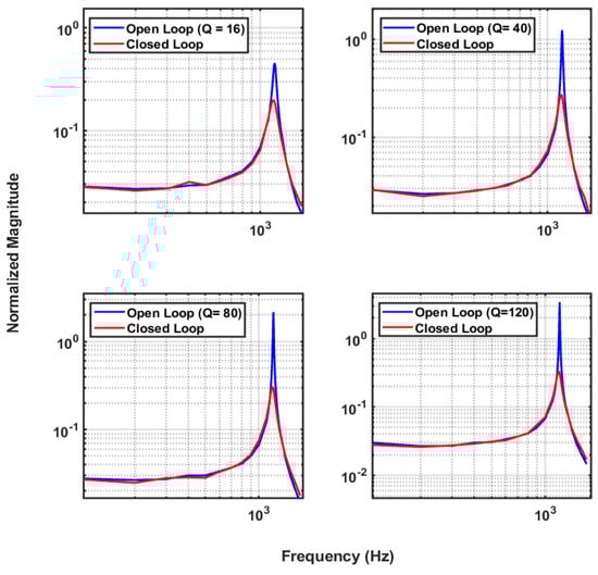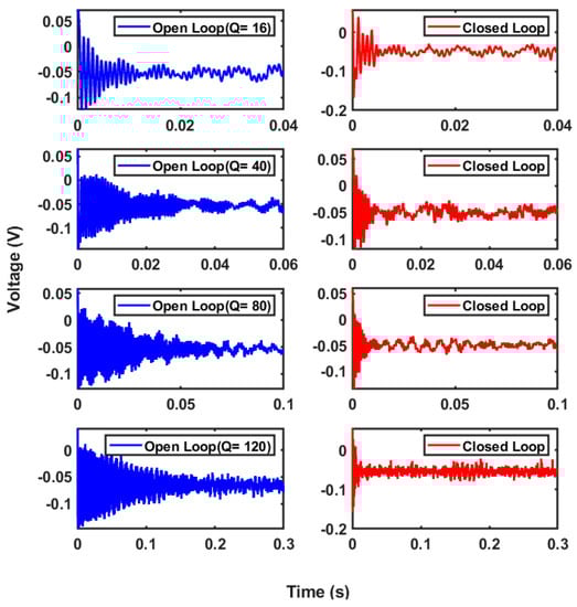 The same setup was used to study the step response of the system by applying a constant 7 V DC voltage for a short period. Figure 12 shows the time response result for both open- and closed-loop configurations for the same quality factor. The data clearly show that the system’s ringing increased as the open-loop system’s quality factor increased. However, a reduced oscillation was observed in the closed-loop system with the same quality factor as that of the open-loop system. The reduction in the output oscillation and settling time was estimated at around 85% in the closed-loop configuration compared to the open-loop configuration. Table 3 compares the performances of open and closed loop systems.