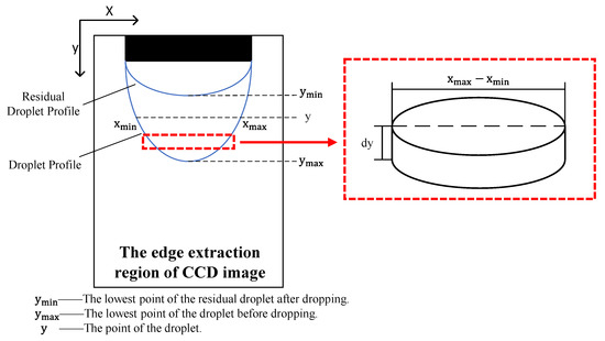 Given that the emitter was mounted nearly vertically, the droplet was assumed to be pendant and axisymmetric [15,18]. Using this axisymmetric model, we split the droplet into a collection of cylindrical volume elements along the vertical direction [19], as shown in Figure 3. We integrated the droplet volume element along the direction of droplet growth to determine the pixel volume of the droplet. To confirm the proportional relationship between the pixel and the real size, we defined a proportion coefficient as the ratio of the outer diameter of the emitter to the corresponding pixel, as expressed in Equation (8). This allowed us to calculate the real volume of the droplet from the pixel volume, as shown in Equation (9).