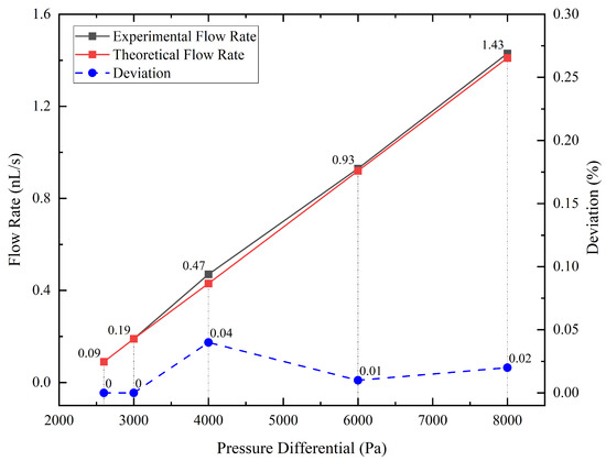 After we obtained the data about the weight of droplets and the time it took them to accumulate, we used Equation (7) to calculate the experimental value of the average flow rate at different pressure differentials and Equation (5) to calculate the corresponding theoretical flow rate. As shown in Figure 4, the red line is the theoretical value, and the black line is the experimental value, which is very close to the red line and almost linear. Additionally, the blue dotted line is the deviation, which is the experimental value minus the theoretical value. The maximum error is 0.037 nL/s, which is less than the 0.1 nL/s anticipated resolution of the flow supply system, meaning that the flow supply system achieves the design expectations.