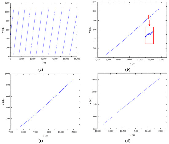 Correlation between time and droplet volume: (a) full experimental time record; (b) one cycle of the droplet growth period; (c) first and second stages of the droplet growth process; (d) third stage of the droplet growth process.