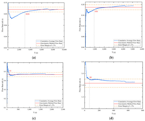 The accumulation average flow rate: (a) pressure differential 2600 Pa; (b) pressure differential 3000 Pa; (c) pressure differential 4000 Pa; (d) pressure differential 8000 Pa.