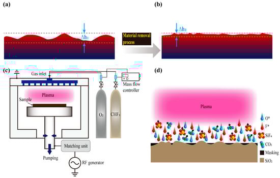 As shown in Figure 1a, the optical sample usually has a large form error after being milled or roughly polished, and a large amount of material needs to be removed from the sample surface in the full-aperture range. In this case, the proposed plasma figure correction method based on multiple distributed material removal functions is used for this processing stage. It enables efficient convergence of initial form errors and provides a transition (as shown in Figure 1b) to subsequent ultra-precision optical machining stages (such as magnetorheological polishing, ion beam figuring, etc.). The proposed plasma figure correction method based on multiple distributed material removal functions for the efficient figure correction of optical components is originated from a capacitively coupled plasma (CCP) etching technology, which is characterized by low temperature and low pressure. Figure correction was performed on the apparatus as shown in Figure 1c. The reaction gas is a mixture of CHF3 and O2; oxygen as an auxiliary gas is mainly used to reduce the deposition of fluorocarbons on the surface [27]. The substrate is connected to a matcher, which is connected to the RF power supply. The matcher is used to match the impedance between the source and the target to maximize the forward RF power. Under RF excitation, a glow discharge is generated in the flat capacitor, causing a sheath layer to form on the surface of the element placed on a water-cooled platform. At the same time, as shown in Figure 1d, the sheath voltage drives the charged particles in the plasma to move to the workpiece surface, causing them to react chemically with the atoms on the surface and form volatile gas molecules. Finally, this reaction product is pumped away to form material removal.