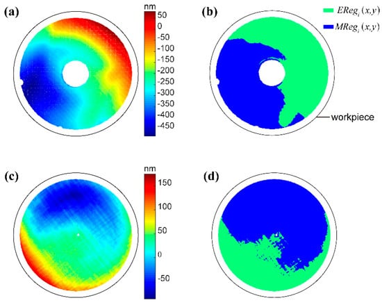 Etched region and masking layer region of the different surface shapes. (a) error map of surface 1; (b) etched region and masking layer of surface 1; (c) error map of surface 2; (d) etched region and masking layer of surface 2.