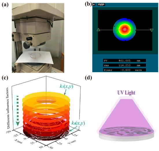 (a) Zygo GPI150 interferometer; (b) initial form error; (c) the influence factors used for the first eight distributed material removal functions; (d) schematic diagram of a printed UV-curable ink masking layer.