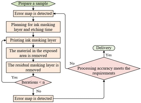 Figure 3b shows the initial form error of the measured quartz mirror, and Figure 3d is the schematic diagram of a UV-curable ink masking layer printed on the surface of a preprocessed workpiece. The influence factors used for the first eight distributed material removal functions are shown from top to bottom in Figure 3c. As can be seen from the pattern of ki(x,y), the influence factors become more fragmented and scattered as the etching cycle increases, which is due to the gradual convergence of the residual error of the mirror. The process flow of the plasma figure correction method based on multiple distributed material removal functions is shown in Figure 4.