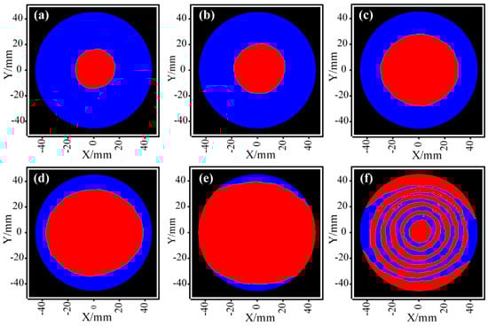 Figure 5a–f show the distributions of the material removed by etching on the workpiece surface during the first six etching cycles. The blue part indicates MRegi(x,y) under the protection of the masking layers, whose material removal was 0, and the red area indicates ERegi(x,y), whose specific etching depth was determined by the corresponding planning algorithm. As shown in Figure 5, multiple distributed material removal functions could be delineated by printing a masking layer to obtain the desired material removal distribution in each figuring cycle. In contrast to the complex and tedious photolithography process, the inkjet printing method is less expensive, does not require special masks, and can flexibly create MRFi of any shape in the full-aperture range. Moreover, since RIE involves dry etching with anisotropic properties, the shape of the MRFi is no longer the usual Gaussian-like, but has nearly parallel removal properties to the material, which is not the same as some conventional polishing methods. Obviously, the use of multiple sets of different MRFi allows to obtain the desired material removal distribution and to remove the workpiece material in the full-aperture range.