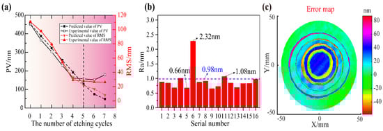 Figure 6a,b shows the variation of the PV and RMS of the residual error with the etching cycle and the roughness of the etched workpiece surface, respectively. It can be seen that the simulated PV and RMS were basically the same as the detected values in the first five etching cycles, and the residual error converged gradually as the number of iterations increased. However, in the following two cycles, the detected PV and RMS did not continue to decrease, and the PV even appeared to increase. In addition, as shown in Figure 6b, 16 areas were selected equally spaced on the workpiece surface to measure the roughness of the quartz surface before and after being etched. Roughness (620 µm × 475 µm range) was measured by a 3D optical surface profiler (NewView 7300 by Zygo, Middlefield, CT, USA). Before being etched, the average roughness value of 16 areas on the surface was 0.98 nm. Most of the roughness on the workpiece surface after figuring was in the range of 0.66~1.08 nm. Therefore, the proposed plasma figure correction method does not distinctly deteriorate the roughness. Finally, the reflected wave-front error of the quartz sub-mirror converged from ~461 nm PV and ~114 nm RMS to ~157 nm PV and ~28 nm RMS through six etching iterations in total effective figuring time of ~47 min. The figure correction of the quartz sub-mirror based on multiple distributed material removal functions was achieved.