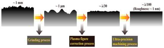 Typically, optical components have approximately micron-level machining errors and millimeter-level subsurface damage layers after being milled and roughly polished. In order to take full advantage of the fast convergence of surface accuracy in the full-aperture range, the proposed plasma figure correction method based on multiple distributed material removal functions is executed between the grinding process (milling or rough polishing) and ultra-precision machining process, as shown in Figure 7. This processing method can provide gentle, non-contact, and parallel material removal in the whole-aperture range. It can be expected that the proposed plasma figure correction method will play an important role in the high-efficiency and low-damage processing technology of large-aperture optical components.