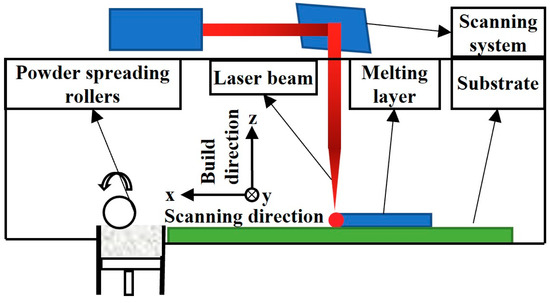 The 316L stainless steel sample was prepared using laser power bed fusion (LPBF) additive manufacturing, as shown in Figure 1. The build direction was along the additive manufacturing, which was set as the z direction, and the scanning directions vertical to the build direction, which were set as x and y, respectively. The metal powder of the raw material of the additive manufacturing had a diameter of 15 μm–52 μm. During the LPBF process, the laser power was 300 W, the scanning speed was 650 mm/s, and the thickness of a single layer was 50 μm, in which each layer was rotated 67° before scanning the next layer, and the scanning distance between adjacent the passes was 140 μm.