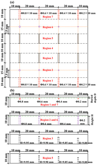 Artificial defect design of the additively manufactured block: (a) top view and (b) main view.