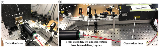 Laser ultrasonic experimental setup: (a) generation laser and optical path unit, and (b) detection laser and sample.