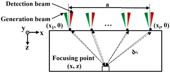 The specific implementation of the synthetic aperture focusing method is shown in Figure 4. The ultrasound is excited and received at the surface opposite to the defect. The laser sweeps in the x–y plane with a certain scanning step. Each sweeping point is noted as (xi, 0), where i = 1, 2, …, n (n is the total number of scanning points in the x direction), and the synthetic aperture focusing point is noted as (x, z). The ultrasound at each sweeping point reaches the focus and is reflected back in the original path. Then, the ultrasound propagation time during this period is denoted as ti, and ti can be calculated as shown in Equation (1),