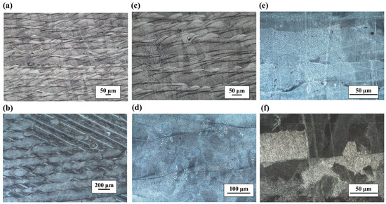 The metallographic microstructures in the y–z plane (vertical x direction) and x–y plane (vertical z direction) are shown in Figure 5, where Figure 5a,c,e corresponds to the microstructure in the y–z plane and Figure 5b,d,f is related to the microstructure in the x–y plane. Regarding the y–z plane, the metallography of Figure 5a,c is operated using chemical etching. Layers of fish-scale stacking can be easily seen, while the fusion lines of the adjacent layers are interlaced together, which makes it difficult to distinguish the interlayer interface. Because of the influence of powder size, scanning speed, laser power, and other parameters, the fusion line of the interlayer is not exactly parallel, and the interlayer thickness is obviously larger than the single thickness of the metal laying powder. Each layer of the passes consists of two parts, light and dark, in which the dark passes are angled approximately 20° towards the direction of the build. It is shown all the passes except the top layer are remelted with the latter one during additive manufacturing scanning. In Figure 5e, the different orientations of the dark and bright bands can be more clearly observed through electrolytic etching. On the x–y plane, the metallography in Figure 5b,d is finished with chemical etching. The microstructure consists of “weld paths”, in which the width of the weld paths and the cross angle of the weld paths of different layers are similar to the scan spacing and rotation angle of the process parameters, respectively. After electrolytic etching, as shown in Figure 5f, it is found that some grains are truncated by the weld path boundaries, but some continue to grow, which might be due to the intersection of adjacent weld paths during the melting–solidification process, as well as secondary remelting.