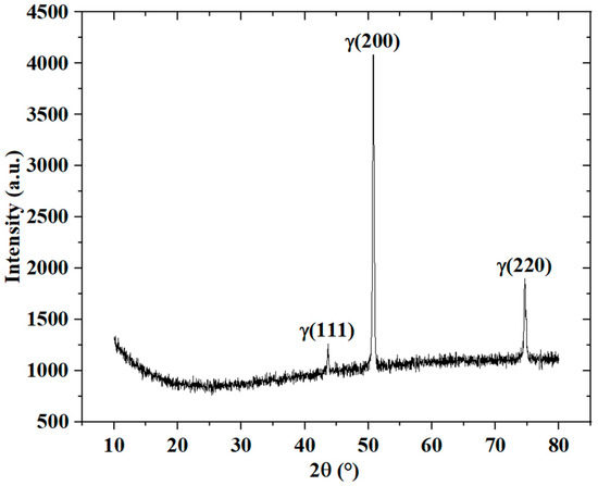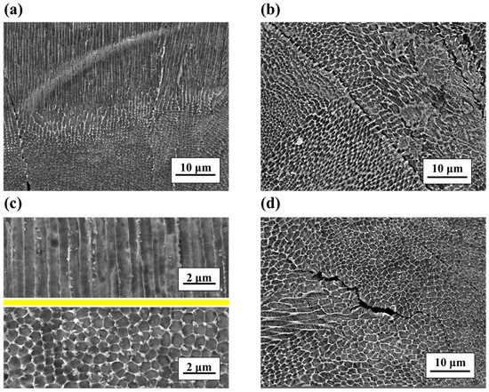 The physical phase composition of samples was analyzed by X-ray diffraction, as shown in Figure 6. The phase composition of the laser power bed fusion 316L stainless steel components is mainly γ-austenite single-phase organization, and the diffraction “triple peaks” of the (111), (200) and (220) crystal planes are marked in Figure 6. For further details, scanning electron microscopy (SEM) was applied to observe the microstructure. The electron microscopy scans in the y–z plane are shown in Figure 7a,c, while the electron microscopy scans in the x–y plane are shown in Figure 7b,d. In the y–z plane, the dark band and the bright band in the previous metallographic phase showed that the former was columnar and the latter was regular-cell-like, as shown in Figure 7a. The specific morphology of the columnar and cell-like results is shown in Figure 7c. In the x–y plane, the dark and bright areas in the previous metallographic phase showed that the dark area within the weld paths was in the form of a cell-like shape that approximated an equiaxed crystal, while the bright area at the boundary of the weld paths was in the form of an elongated strip, as shown in Figure 7b,d. According to the grain growth theory, this might be due to the temperature gradient of the weld path during additive manufacturing. The temperature inside the weld paths was evenly distributed, then the grains grew in all directions, while the temperature distribution at the weld path boundary was non-uniform, and the grains then grew in the opposite direction of the heat flow.