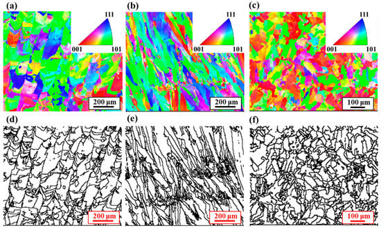 Inverse pole figures and grain boundary maps for EBSD analysis in different directions: (a–c) inverse pole figures, (d–f) grain boundary maps, (a,d) x direction, (b,e) y direction, and (c,f) z direction.