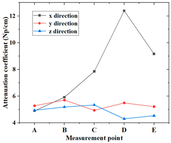 Similarly, five positions, A, B, C, D, and E, were chosen for the measurement of attenuation on the corresponding planes for each direction. The attenuation in the three directions are shown and listed in Figure 9 and Table 3, respectively. In the same direction, the attenuation at different measuring locations are various, in which the largest deviation is in the x direction with a coefficient of variation of 32.84%. Compared with the wave speed, the attenuation is more sensitive to the microstructure. With the same central frequency of the transducers, the z direction has the largest mean grain diameter in the x–y plane, but has the smallest attenuation. From the results of EBSD, the shape of the grain in the z direction is approximately equiaxed crystal, and those in the x and y directions are mainly columnar crystals with a certain inclination angle to the build direction. When ultrasonic waves propagate in the z direction, the propagation direction is actually parallel to the build direction, which is along both sides of the columnar crystal. Then, the smallest attenuation in the z direction probably contributes to the relatively less interfaced with the grain boundary. On the other hand, when ultrasonic waves propagate in the x and y directions, the ultrasonic waves propagate perpendicular to the build direction, which is along the cross section of the columnar crystal. Thus, more scattering occurs because of the grain boundaries, which results in a large attenuation in the x and y directions, as measured.