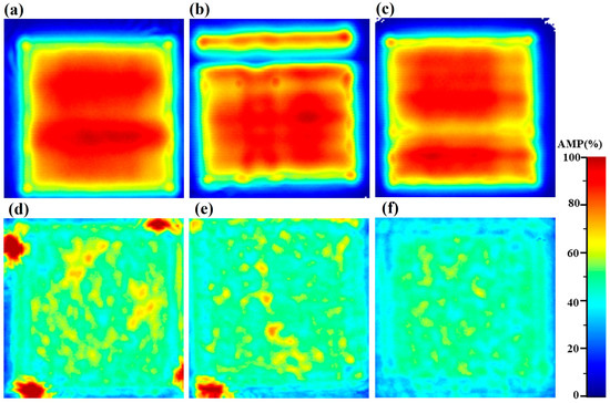 C-scan of backwall and diffuse backscattered in different directions: (a–c) backwall, (d–f) diffuse backscattered, (a,d) x direction, (b,e) y direction, and (c,f) z direction.