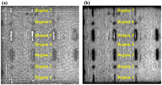 As shown in Figure 11a,b, the raw data and the improved image with the synthetic aperture focusing method are plotted, in which the regions are designed as shown in Figure 2. In Figure 11a, for regions 1 and 7, only the side-drilled holes with diameters of 0.8 mm, 0.6 mm, and 0.4 mm could be faintly visible, while the defect with a diameter of 0.2 mm cannot be identified. Similarly, the inspection results of regions 2 and 6 show blurredly flat-bottomed holes with diameters of 0.8 mm, 0.6 mm, and 0.4 mm, but the defect with the diameter of 0.2 mm cannot be recognized. These two holes with a diameter of 0.2 mm need to be double checked in the following digital radiograph (DR). The notches in both region 3 and region 5 can be totally confirmed. As shown in Figure 11b, the image is reconstructed via the synthetic aperture focusing method. Compared to the image with the raw data, most of the defects with flaws in regions 1, 2, 6, and 7 could be clearly observed, except for the diameter of 0.2 mm. It is worth mentioning that the diameters of 0.8 mm, 0.6 mm, and 0.4 mm could be more clearly visible. In regions 3 and 5, all the notches can be found, but the diameters of 0.5 mm and 0.2 mm are not quite different, which also need to be double checked in the following analysis of DR testing.