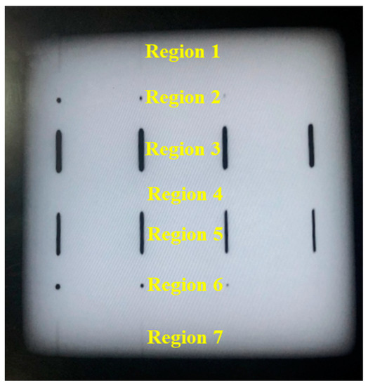 To verify the results of the laser ultrasonics, digital radiograph (DR) was utilized and the inspection results are shown in Figure 12. It is found that the DR results agree well with the above laser ultrasonic results. For different regions, the defects are clearer for both locations and shapes when compared with the previous laser ultrasonic results, which is the advantage of DR technology. Specifically, the undetected flaws, which were originally designed, still have not been determined. In regions 3 and 5, the left two rows are almost exactly the same. This might be due to the forming quality during additive manufacturing. Thus, laser ultrasonic is a good choice for the additively manufactured components, especially with SAFT for decreasing the effect of anisotropy.