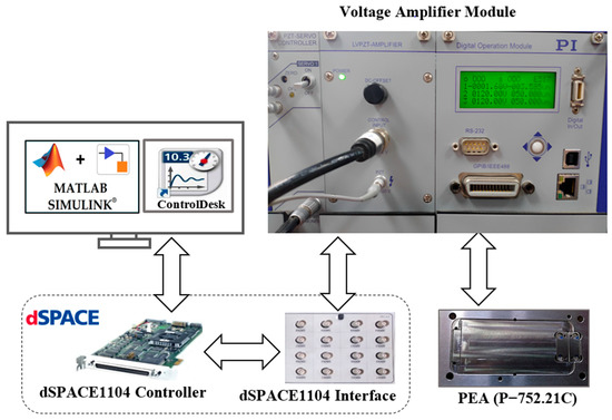 The experimental setup is shown in Figure 1. It consists of a piezo-actuated nanopositioner connected to an amplifier and a PC equipped with a controller card. The nanopositioner (PI GmbH & Co., Karlsruhe, Germany, P-752.21C) [37] is equipped with a flexure hinge mechanism guided by a multilayer piezoelectric ceramic stack actuator. The piezoelectric ceramic material could be induced by an operating voltage of −20 to 120 V to generate deformations, such as expansion and contraction. Thus, this material can force the flexures to move and achieve fast and precise displacement with a motion range of up to 35 µm. The piezo-actuated nanopositioning stage is integrated with a capacitive sensor (PI GmbH & Co., D-015) to measure the displacement. This sensor has a high bandwidth of 10 kHz and can provide a subnanometer resolution of 0.01 nm. The voltage amplifier (PI GmbH & Co., E-505.00) [38] can amplify the input voltage of −2 V to +12 V by a voltage gain factor of 10 so that it can drive the PEA. The control board (dSPACE Co., Wixom, MI, USA, dSPACE 1104) [39] is used to generate the control signals and send or receive the commands through its DAC/ADC ports. First, the control block diagrams are developed using Simulink software. Then, the C code of the developed Simulink model is generated by a compiler supported by dSPACE and connected with the controller using the Real-Time Interface (RTI) library to run the process of the hardware-in-the-loop simulation. For performance evaluation, monitor software (ControlDesk) is used to visualize and save the results.