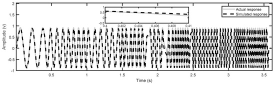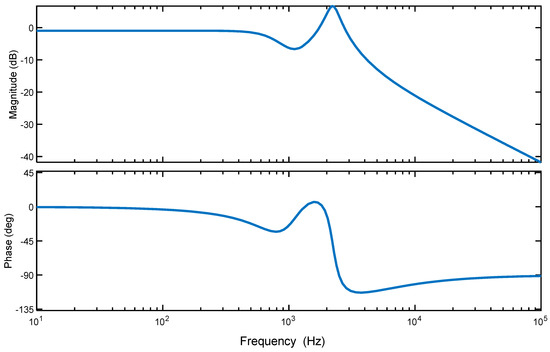 Before modeling the hysteresis, the identification of linear dynamics was performed to find a linear model of the overall system. For this purpose, the excitation of the experimental platform was performed by a sine wave chirp signal with multiple frequencies and an amplitude of 1 V to avoid the appearance of hysteresis in the response. The obtained experimental data were used to characterize the dynamic input–output behavior of the system and identify the plant transfer function. The coefficients of the linear dynamic model were estimated using the recursive least-squares (RLS) method [40]. The transfer function was obtained as follows: