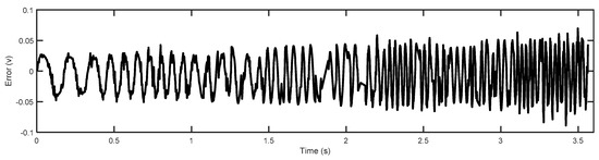 where the order of the model dynamics was chosen to be four as it properly describes the system dynamics and matches the actual response well, as shown in Figure 2. Additionally, Figure 3 shows that most error values of the linear dynamic model are within the range of about ±0.05 V. Higher-order models are required to accurately capture the dynamics, but they lead to an increase in the order of the feedback controller, which increases the execution time of the proposed control scheme, thus affecting the applicability of the control design. Figure 4 shows the frequency responses obtained by the identified model; it can be noted that the first resonant mode occurs around 2200 Hz.