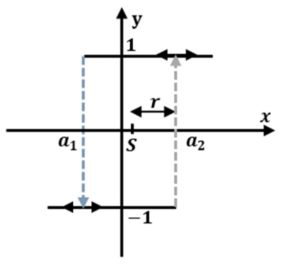 The classical Preisach hysteresis model [41,42] is developed by the relay-type operator , as depicted in Figure 5. The relay operator can be expressed as follows: