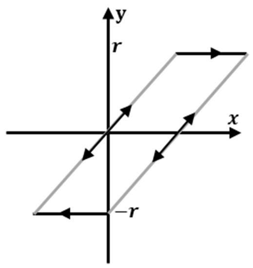 In this study, the Preisach plan was divided into a set of intervals (cells) to reduce the complexity of the model, and then the density function was approximated by using a regression method to improve the accuracy of identification and enhance the generalization ability of the model. In this case, we used the stop operator, as depicted in Figure 7. This operator is represented by a couple of thresholds, +r and −r, which can be defined as: