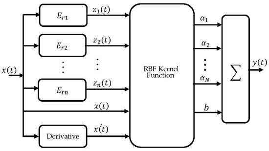 Then, the outputs of the stop operators were used as inputs to the prediction algorithm. This predictor was built by using the least-squares support vector machine (LSSVM) [22,43]. The LSSVM combines the advantages of replacing inequality constraints with equality constraints and adopting the error sum of the square loss function in the cost function rather than the insensitive loss function of the standard SVM. These important simplifications linearize the problem and make the algorithm a powerful tool for solving regression problems. Basically, the LSSVM regression for input–output data pairs (z, y) is defined as: