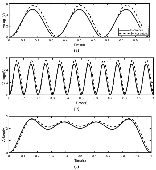 The excitation signals of the PEA in the training phase and the corresponding output signals of the sensor: (a) first training signal; (b) second training signal; (c) third training signal.