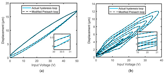For a satisfactory generalization ability, we included the derivative of the input reference signals, as it helps to describe the rate-dependent characteristics that are based on both input voltage and input rate. Figure 8 shows how the overall structure of the proposed modified Preisach hysteresis model was built. This model was trained, and the simulation results will be presented and discussed in the next subsection.