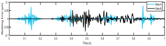 The effectiveness of the proposed hysteresis model was validated by two test datasets, as shown in Figure 10. This figure shows the actual hysteresis loops against the predicted hysteresis loops for the considered actuator. It can be seen that there is a good match between them, in the sense that the model achieved good predictive performance. The root-mean-square-error (RMSE) was used as a measure of modeling quality. The suggested model achieved low prediction error values in test datasets, A = 0.01061 μm and B = 0.01086 μm, with an average RMSE of 0.0107 μm. For further comparison, we also plotted the instantaneous prediction errors in Figure 11. It can be observed that most error levels are within the range of ±0.05 μm, which indicates that our model yields an extremely good fit, and hence its inverse can be amenably used for designing a practical compensator.