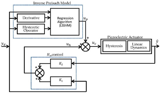 To overcome the overfitting problem, the authors in [26,27,28,29] proposed hysteresis models based on a regression algorithm. The input of the hysteresis model was selected based on an autoregressive model with exogenous input (NARX), where the current output is dependent not only on the current inputs but also on the past inputs and past outputs. The experimental results indicated that the outputs could be predicted, but the output of the feedforward compensator accumulates errors over time in real-time control experiments due to the feedback [21,30]. In previous studies [31,32], the authors modified the Preisach model using a kernel-based machine learning method combined with a hysteresis memory to overcome the error accumulation limitation. The compensator has been constructed using two parts; hysteresis operators to solve the mapping problem and an inverse Preisach hysteresis model based on the LSSVM algorithm optimized by particle swarm optimization (PSO) and the improved PSO algorithms to estimate the density function. The results showed that the modified Preisach model outperformed the LSSVM-NARX and ANN hysteresis models. However, we used a proportional–integral–derivative (PID) feedback controller to reduce remaining errors, as PID parameter tuning is a time-consuming task and significantly depends on a trial-and-error method through experiments. This makes parameter tuning very difficult to obtain the required performance. Furthermore, PID control is incapable of meeting the robustness and disturbance rejection requirements. Therefore, an alternative feedback controller is needed to avoid the limitations of the classical PID controller and improve positioning accuracy.