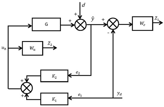 The feedback controller should be designed so that the closed-loop system is robust and can achieve the desired tracking performance. For this purpose, the two-degree-of-freedom optimization method [50] was adopted in our study. The scheme of this control strategy is shown in Figure 13. The system has a reference signal () and external disturbance (d). G is the nominal plant model of the considered system, given by Equation (1), which is used for the synthesis of the controller, and and are the controllers to be designed. Therefore, the output response, control signal, and error signals of the closed-loop systems can be expressed as follows: