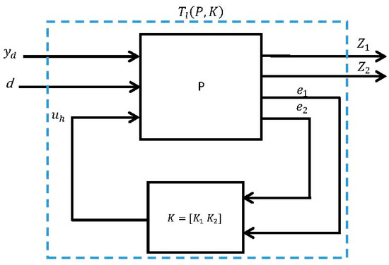 Two weighting functions were suggested for controller design. is a weighting function on the control signal and is a weighting function on the error signal (). The closed-loop system was then represented in the standard configuration using the lower linear fractional transformation (LLFT) technique [51], as shown in Figure 14. Here, P represents the generalized plant model and and are the two controlled outputs. More details about this method are available in [50]. The system is, therefore, described as follows: