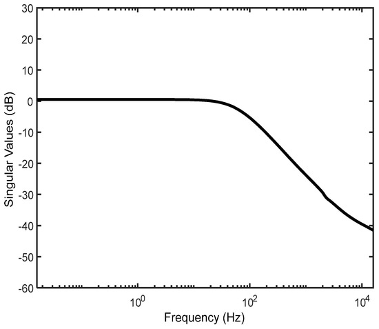 where the parameters of these controllers are given in Table 4. The designed controller meets the desired performance objectives and constraints with a minimal achievable value () of 0.984. The sensitivity functions lie under the curves of the constraints represented by and , as shown in Figure 15 and Figure 16. These figures show good modulus margins, dB and dB, and a satisfactory tracking bandwidth that covers the reference signals used in this study. These results indicate that the required good performance and disturbance rejection requirements are fully met with our control design.